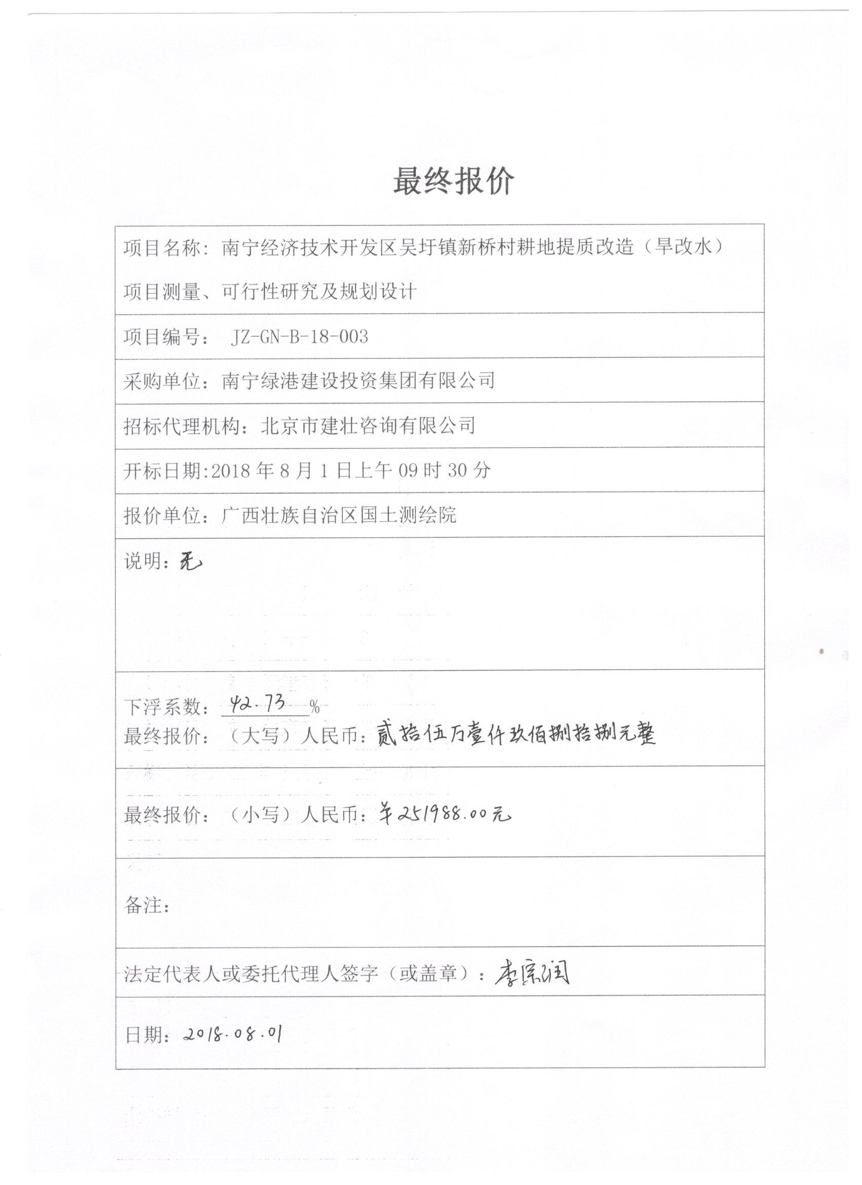 北京市建壯咨詢(xún)有限公司受南寧綠港建設(shè)投資集團(tuán)有限公司委托,根據(jù)《中華人民共和國(guó)政府采購(gòu)法》等有關(guān)規(guī)定,于2018年8月1日就南寧經(jīng)濟(jì)技術(shù)開(kāi)發(fā)區(qū)吳圩鎮(zhèn)新橋村耕地提質(zhì)改造(旱改水)項(xiàng)目測(cè)量、可行性研究及規(guī)劃設(shè)計(jì)以競(jìng)爭(zhēng)性磋商方式進(jìn)行采購(gòu),現(xiàn)就本次采購(gòu)的成交結(jié)果公告如下: